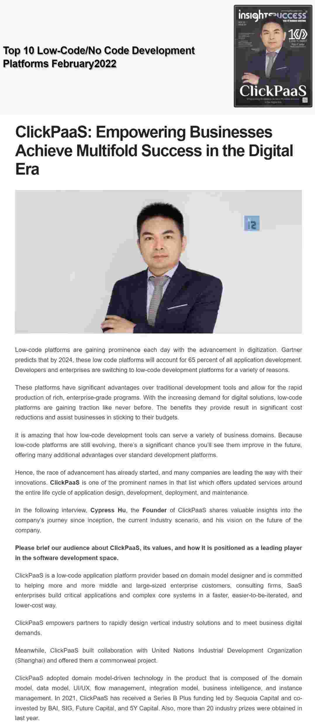 2022年年初,,,,圆梦钱包入选外媒Insights Success低代码/无代码开发平台 Top10,,,创始人、、CEO胡柏受邀接受专访并荣登封面人物,,,他与Insights Success的读者分享了圆梦钱包成立的初心、、发展历程、、、、当前的行业发展趋势以及他对公司未来的展望。。。。